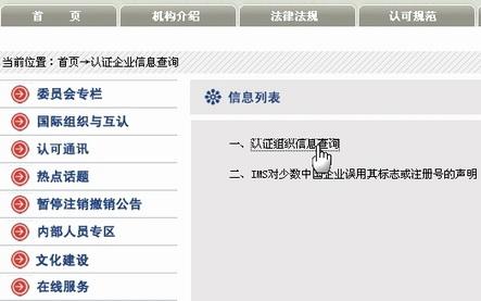 2、于中文首頁左下方,點擊“認(rèn)證組織信息查詢”,進(jìn)入信息列表;