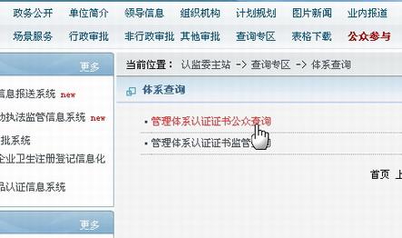 3、點擊“體系查詢”下“管理體系認(rèn)證證書公眾查詢”字樣,進(jìn)入正式查詢;